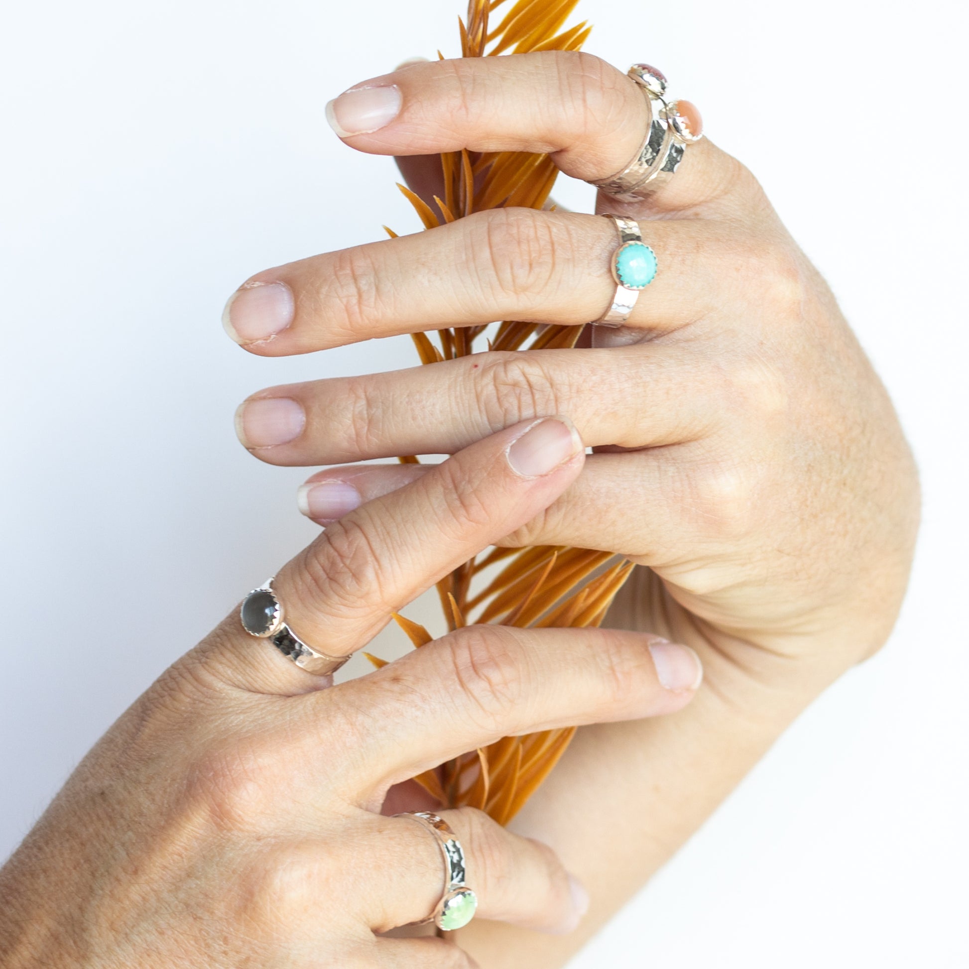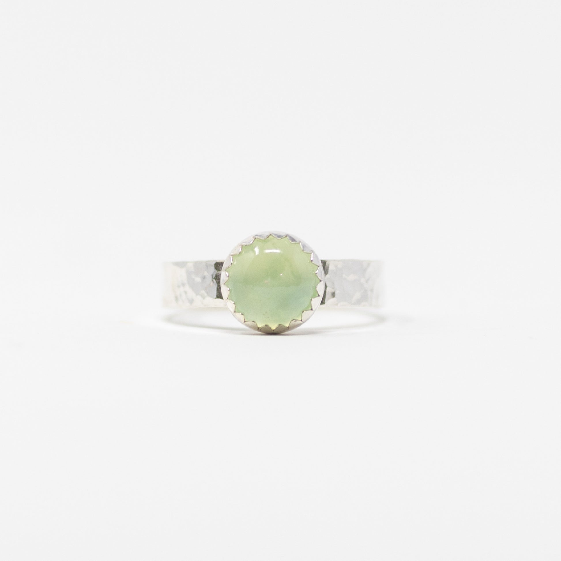 A light green stone with an inner glow is the embodiment of spring. A bright pop of color for your finger, perfect on its own or in a stack.